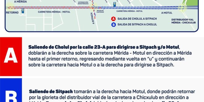 Asimismo, para los conductores que salen de Cholul por la calle 23-A para dirigirse a Sitpach o Motul, deberán tomar la derecha sobre la carretera Mérida – Motul, en dirección a la capital, hasta el primer retorno, regresando mediante vuelta en “U” y continuarán sobre la carretera para Motul o a la derecha para dirigirse con destino a Sitpach.