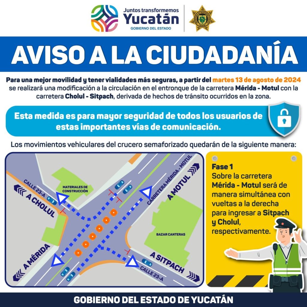 Mérida, Yucatán, 8 de agosto de 2024.- El Gobierno del Estado, a través de la Secretaría de Seguridad Pública (SSP), informa que, a partir del próximo martes 13 de agosto, se realizarán modificaciones a la movilidad vial en el entronque de la carretera Mérida – Motul con la carretera Cholul – Sitpach, con el objetivo de contribuir a mejorar la seguridad de peatones y conductores, así como la circulación en este importante cruce vehicular.
