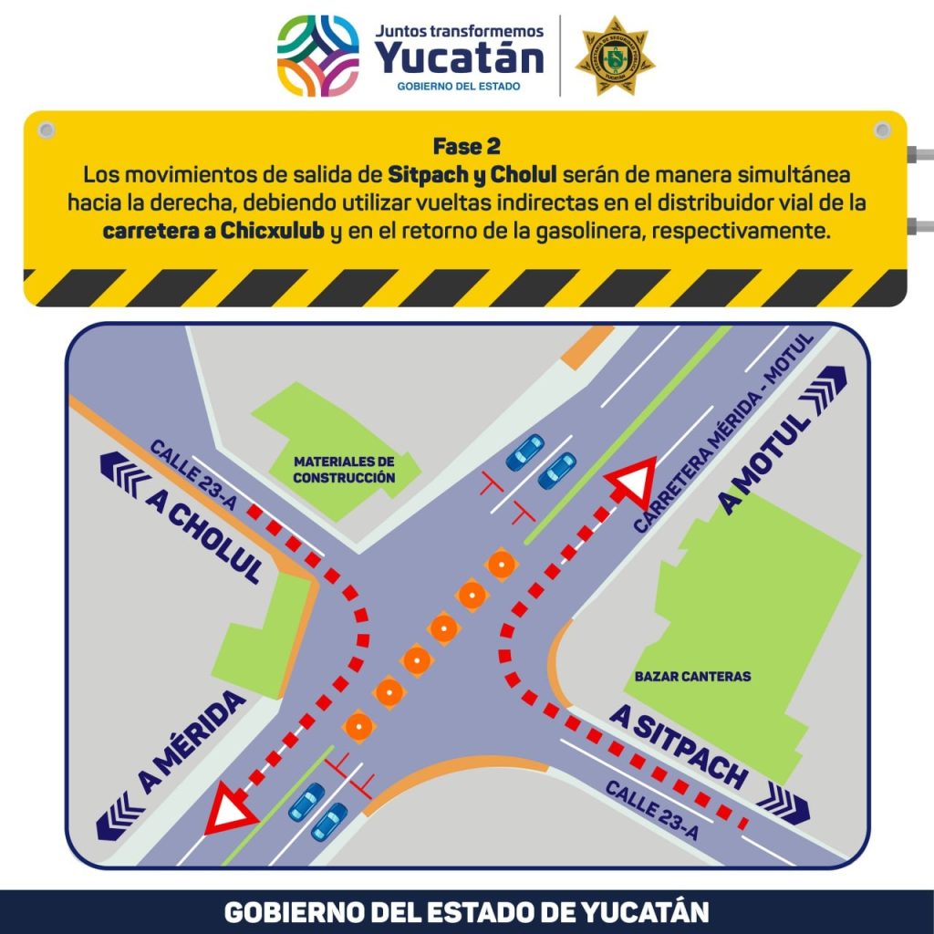 En la fase 2, el encendido de los movimientos de la salida de Sitpach y Cholul será de manera simultánea, hacia la derecha, debiendo utilizar vueltas indirectas en el distribuidor vial de la carretera a Chicxulub y en el retorno de la gasolinera, respectivamente.