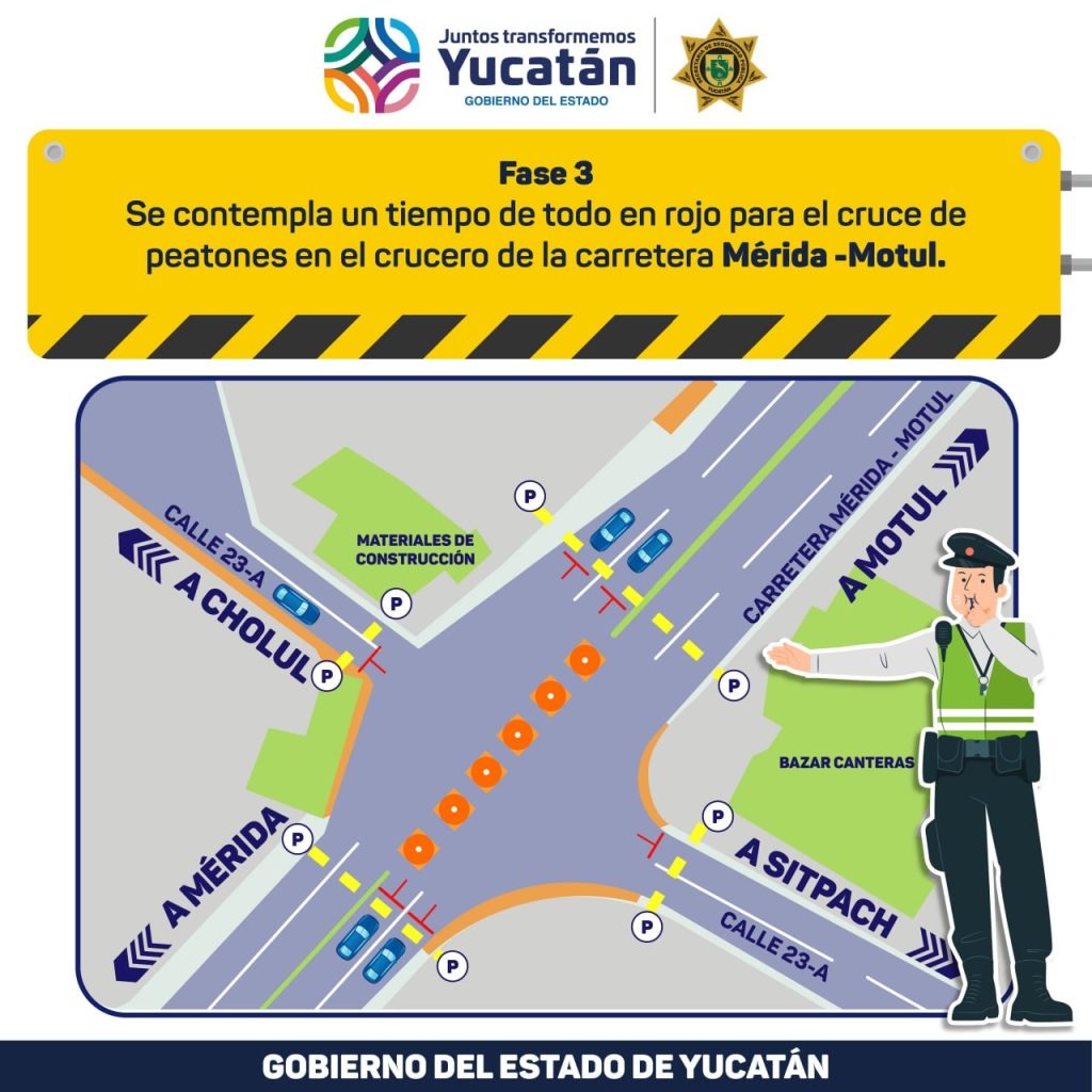 En este sentido, las modificaciones a los movimientos vehiculares del crucero semaforizado ya mencionado, implicarán en su fase 1, para quienes circulen sobre la carretera Mérida – Motul, vueltas a la derecha de manera simultánea para ingresar a Sitpach y Cholul, respectivamente.