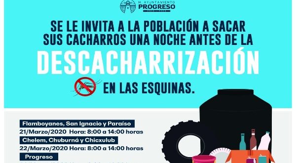 Progreso, Yucatán a 13 de marzo de 2020. La Dirección de Salud del Ayuntamiento de Progreso, en coordinación con la Secretaria de Salud de Yucatán (SSY), informa a toda la población del puerto y de las seis comisarias a prepararse para la próxima “Jornada de Descacharrización” que se llevará a cabo a fin de eliminar cualquier tipo de recipiente u objeto que pueda acumular agua y servir como criadero del mosquito “Aedes aegypti”.