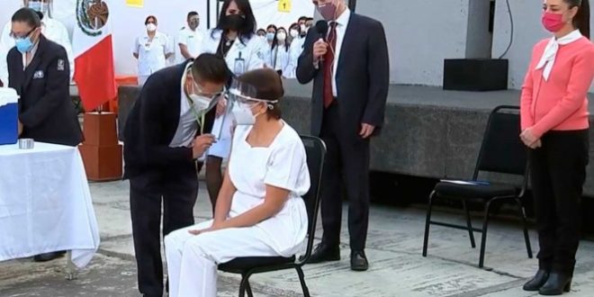 En Palacio Nacional se presenció la vacunación en el Hospital General, de la enfermera María Irene Ramírez, enfermera de terapia intensiva en el Hospital Rubén Leñero, en la Ciudad de México, con quien inicia la primera etapa de vacunación contra el SARS-CoV-2 en México, luego de que ayer llegaran las primeras 3 mil de 34 millones de dosis adquiridas a la farmacéutica mencionada.