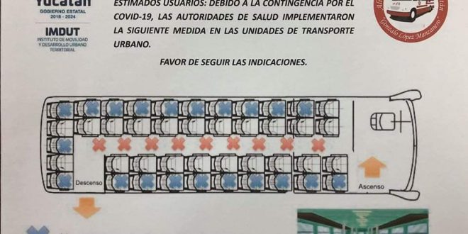 MÉRIDA, Yuc., 03 de abril 2020.- La Alianza de Camioneros anunció que desde hoy hasta el 30 de abril todas las unidades de transporte público aplicarán su sana distancia, por lo que todas las personas deberán ocupar los asientos cercanos a las ventanillas y con ello dejar libre los pasillos.