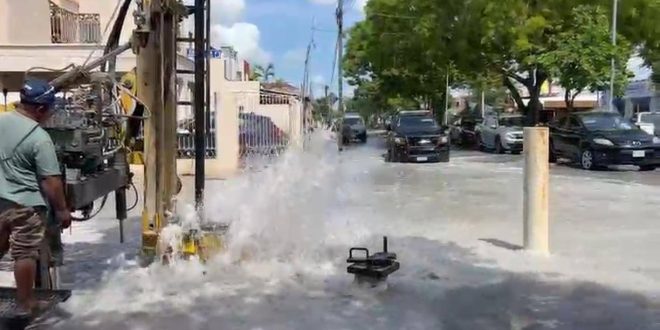 Mérida, Yucatán, jueves 24 de Julio de 2025.- La Dirección de Obras Públicas del Ayuntamiento de Mérida informó que esta madrugada; durante los trabajos de perforación de un pozo en la avenida 7 de Pensiones -a la altura de la sede parroquial- la empresa encargada de los trabajos perforó por error, un tubo de alimentación de agua potable que surte a la zona.