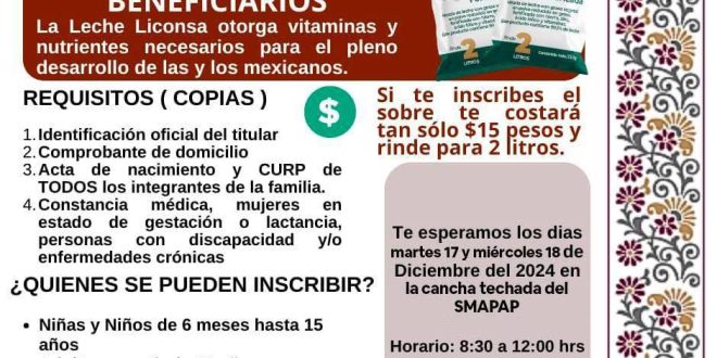 Progreso, Yucatán, a 16 de diciembre de 2024. Programa de Abasto Social Liconsa Yucatán en coordinación con el Ayuntamiento de Progreso, encabezado por el Ing. Erik Rihani González, invita a la ciudadanía de Progreso a inscribirse como nuevos beneficiarios del programa de abasto social de leche Liconsa.