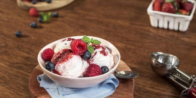 Sirve el helado y decora con un poco de frutos rojos y hojas de menta. Ofrece.