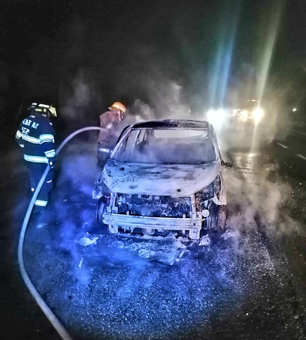 Umán, Yuc., 6 de octubre 2020.- Ardió completamente un vehículo Beat, presuntamente por una falla eléctrica cuando circulaba en la vía federal Mérida – Campeche la noche del pasado domingo.