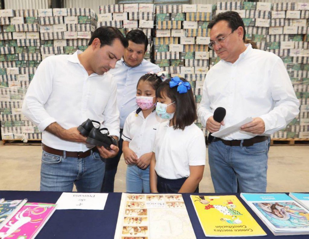 Durante un recorrido por la bodega de Sedesol, desde donde se distribuyen estos materiales, el Gobernador también constató los kits de libros de texto gratuitos, los cuales se complementarán con 206,534 paquetes de uniformes para alumnos de primaria de escuelas públicas, conformados por 2 camisas, un par de zapatos y una mochila, en respaldo a la economía de las familias yucatecas.
