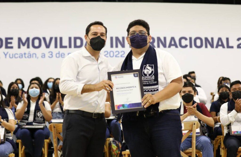 En el Centro de Convenciones “Yucatán Siglo XXI”, el Gobernador Mauricio Vila Dosal entregó reconocimientos a las y los jóvenes sobresalientes de bajos recursos económicos, becados dentro de este esquema estatal, que en próximamente emprenderán el viaje hacia Estados Unidos y Canadá, a través de la Agenda Estatal de Inglés, para promover la internacionalización y fortalecimiento de dicha lengua.