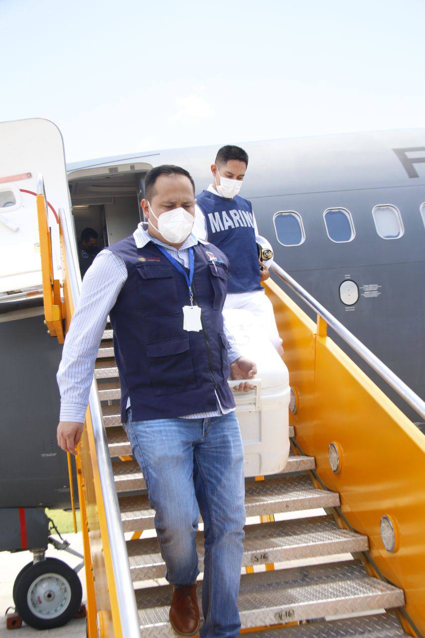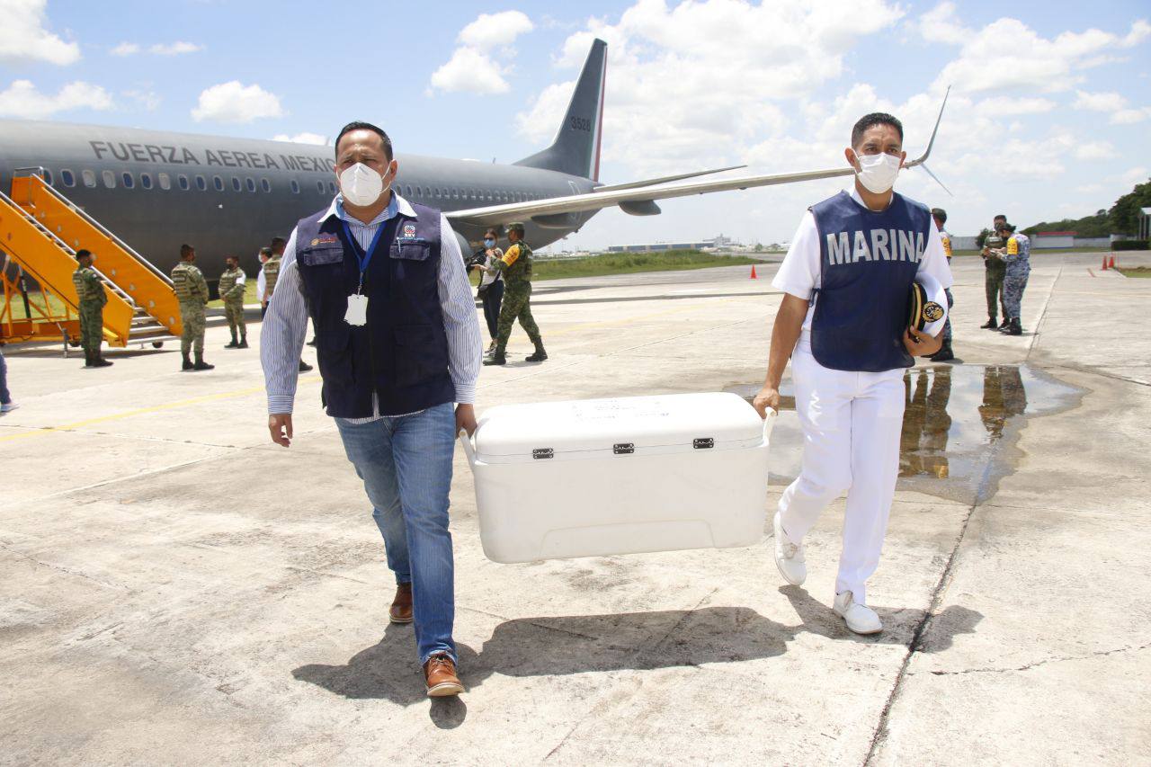 En el arribo del nuevo cargamento de vacunas también estuvo el Teniente Coronel Piloto Aviador Marco Durán García, Comandante Accidental de la BAM número 8 y el Teniente de Navío Andrés Noé Rodríguez García, en representación de la Coordinación Estatal para la Vacunación Covid-19, capitán de Corbeta, Carlos Gómez Montes de Oca.