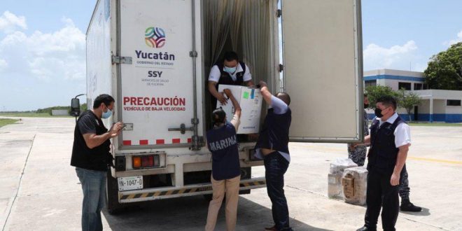 Acompañado de la jefa de Salud Pública del Hospital Naval de Yucalpetén, teniente María Isabel Cab Gupul, el funcionario estatal constató la descarga de los insumos a cargo del personal del Ejército que los colocó en un camión thermoking de la SSY para su traslado al almacén y posterior distribución.