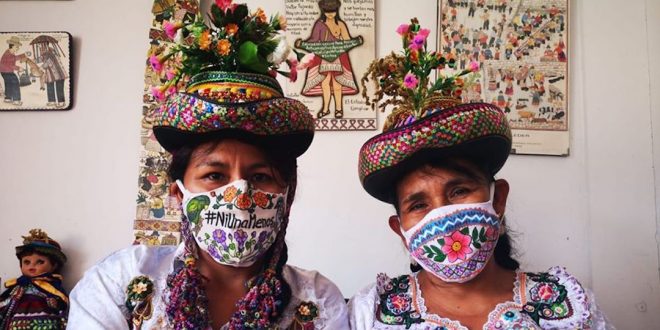 Ante la pandemia por coronavirus, dos artesanas en Perú elaboran cubrebocas con elementos de la comunidad indígena en la que viven.
