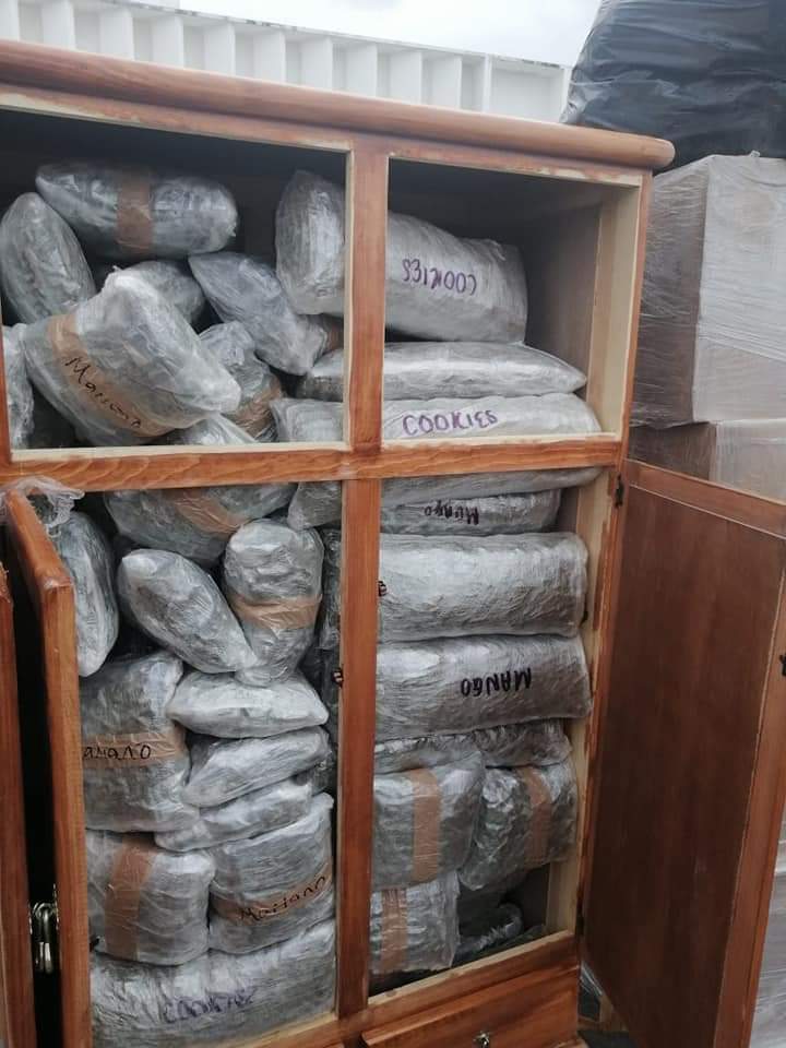 La droga estaba oculta en dos roperos de madera y en cajas de cartón transportados en una camioneta de redilas con placas del Estado de México, simulando una mudanza.