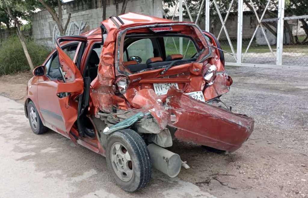 MÉRIDA, Yuc., 18 de octubre 2024.- Vaya choque por alcance recibió un automóvil tipo Matiz propiciado por un camión de volteo en la lateral exterior del Anillo Periférico de Mérida, cerca del entronque de la calle 86 hacia Dzununcán.