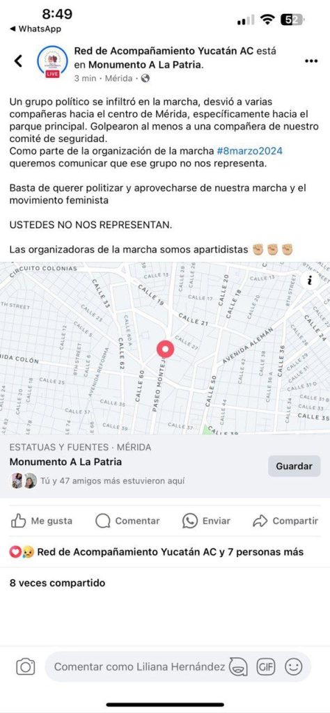 Hace unos minutos, en un comunicado que publicó en su página de Facebook la Red de Acompañamiento Yucatán AC que participó en la marcha manifestó que “Un grupo político se infiltró en la marcha, desvió a varias compañeras hacia el centro de Mérida, específicamente hacia el parque principal. golpearon al menos a una compañera de nuestro comité de seguridad. Como parte de la organización de la marcha #8marzo2024 queremos comunicar que ese grupo no nos representa. Basta de querer politizar y aprovecharse de nuestra marcha y el movimiento feminista; ustedes no nos representan, las organizadoras de la marcha somos apartidistas”.