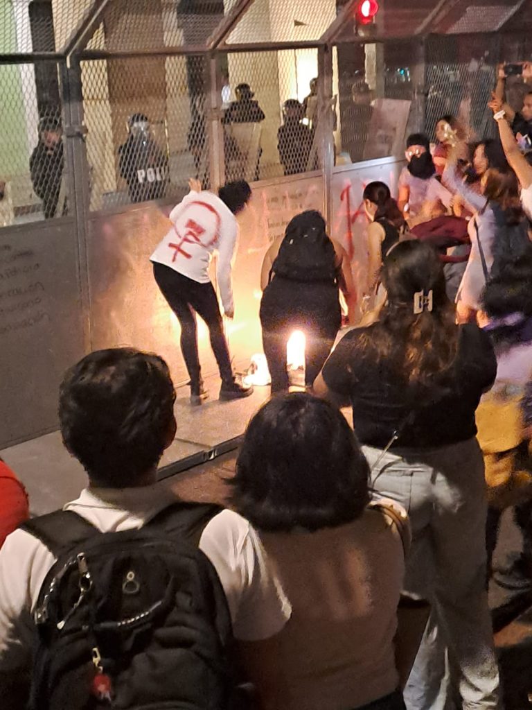 Las mujeres incendiaron pancartas y arrojaron botellas de pinturas a los elementos del cuerpo de bomberos que acudieron a detener el fuego.