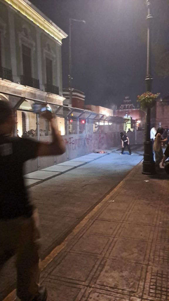 Como se ha dado en otros años, la marcha pacífica fue empañada por un grupo de mujeres encapuchadas de negro que prendieron fuego a las vallas del monumento a Felipe Carrillo Puerto y a las vallas que se instalaron frente a Palacio de Gobierno, intentaron derribarlas e hicieron pintas sobre ellas, así como otros actos de vandalismo.