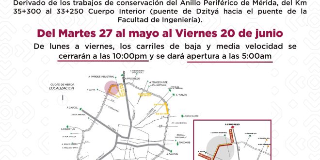 Home / Destacada policía / Atención automovilistas: cierre parcial nocturno en el Periférico de Mérida Sur del 27 de mayo al 20 de junio