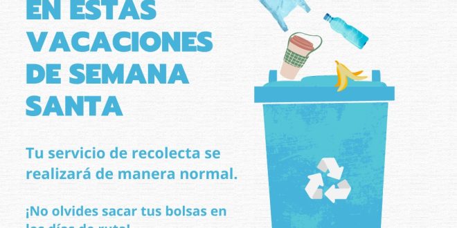 Les informamos que, durante la temporada vacacional correspondiente a la Semana Mayor, el servicio de recolección de basura se llevará a cabo de manera habitual a partir de las 7:30 a.m.