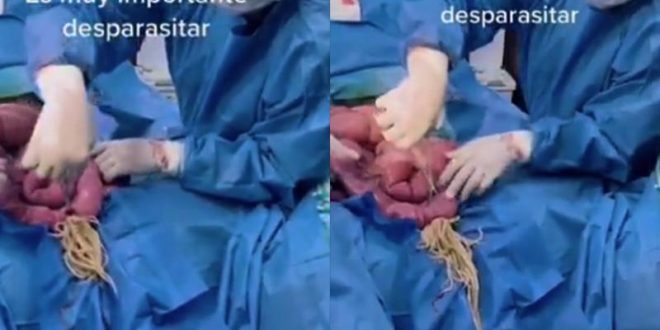 Los gusanos pueden bloquear el intestino, causando dolor y complicaciones graves”, advierten los especialistas, mientras un equipo realiza un corte al intestino y de pronto brotan las lombrices.