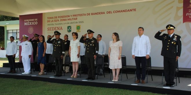 Mérida, Yucatán, 4 de abril de 2023.- El General de Brigada Diplomado de Estado Mayor, Horario Flores Fonseca asumió este día la comandancia de la 32 Zona Militar, en una ceremonia que encabezaron en esta ciudad el General de División de Estado Mayor, Homero Mendoza Ruiz, comandante de la X Región Militar y la titular de la Secretaría General de Gobierno (SGG), María Fritz Sierra, en representación del Gobernador Mauricio Vila.