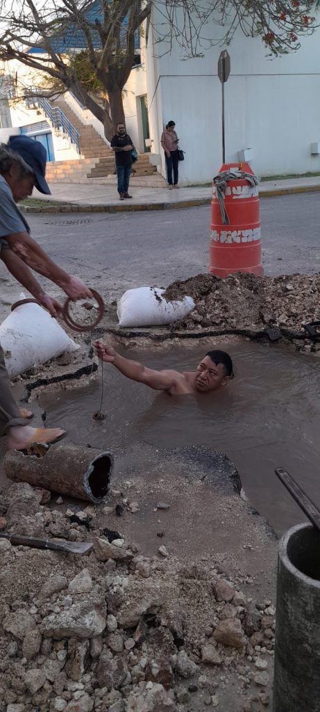 Personal de la Japay atendió ayer 18 de mayo una fuga en una tubería de seis pulgadas ocasionada en la calle 75 por 42 de la colonia Montes de Amé por una empresa a cargo de la construcción de un gasoducto en dicha zona.