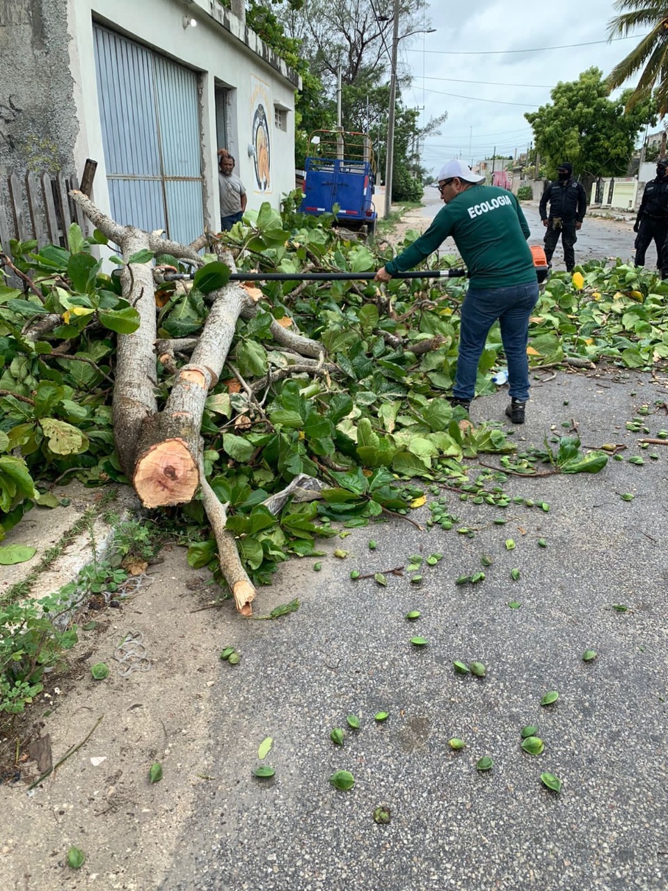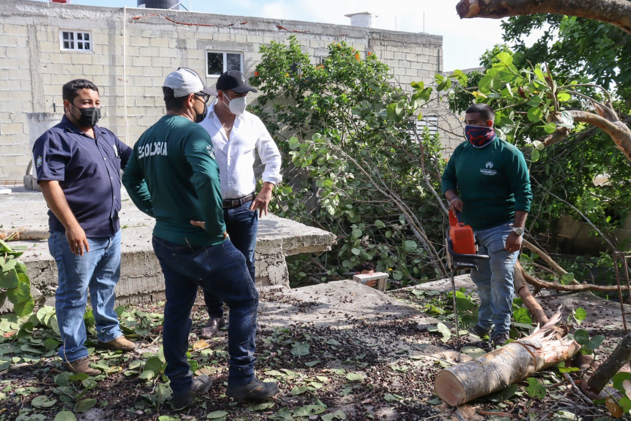 El alcalde Julián Zacarías Curi acude al puerto de Chicxulub a supervisar la poda de un árbol que, por los fuertes vientos cayó y afectó a tres viviendas de dicha localidad