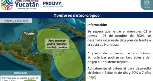 MÉRIDA, Yuc., 27 de septiembre 2024.- En las próximas 24 horas, se prevé cielo medio nublado a nublado, con probabilidad de intervalos de chubascos dispersos, así como tormentas localmente fuertes. Ambiente caluroso a muy caluroso en el día y cálido al amanecer. Se prevé que debido al ingreso de aire …