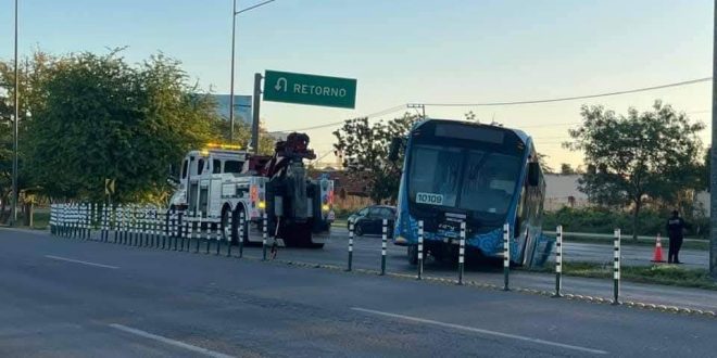 Mérida, Yuc., 25 de noviembre 2024.- La mañana de este lunes se registró un incidente en el periférico poniente de Mérida, a la altura de la Fiscalía General del Estado, cuando un autobús del sistema de transporte Va y Ven terminó en una hondonada tras realizar una maniobra prohibida.