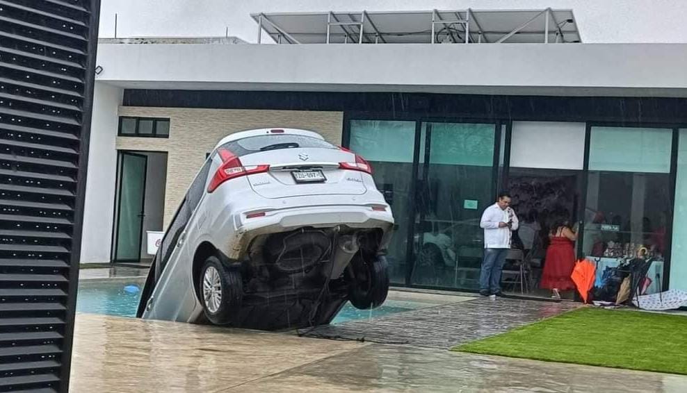 Mérida, Yuc., a 29 de junio 2024.- En una sala de fiestas de la colonia Buena Vista de esta capital yucateca uno de los invitados tuvo un traspié que a pesar de la lluvia, literal se echó un clavado a la alberca con todo y camioneta.
