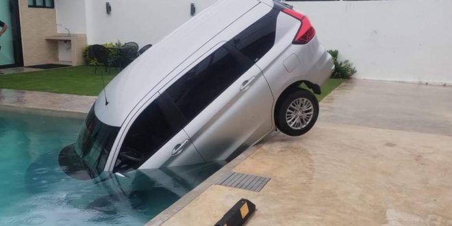 Mérida, Yuc., a 29 de junio 2024.- En una sala de fiestas de la colonia Buena Vista de esta capital yucateca uno de los invitados tuvo un traspié que a pesar de la lluvia, literal se echó un clavado a la alberca con todo y camioneta.