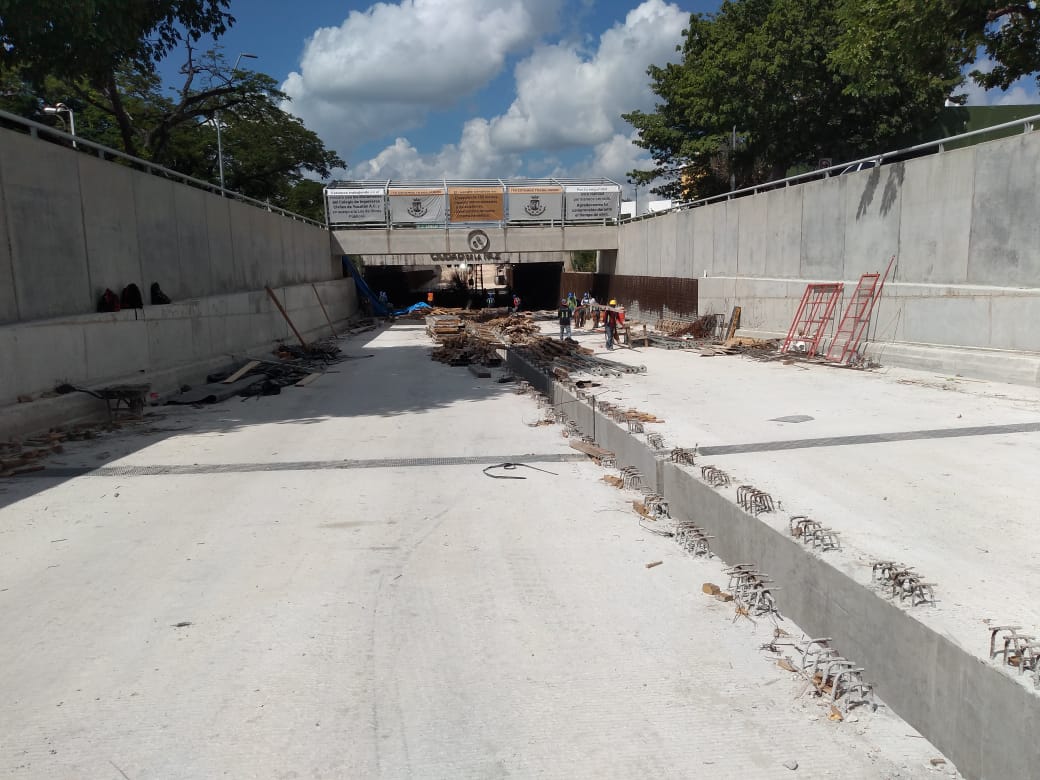 Mérida, Yucatán, a 03 de octubre del 2021.- Se continúa con los avances en la rehabilitación del paso a desnivel de la avenida Prolongación de Montejo en su cruce con Circuito Colonias, en donde se ha concluido con los trabajos de colado de la rampa sur, los avances en el área del túnel y los trabajos de nivelación y rellenos compactos en la rampa norte.