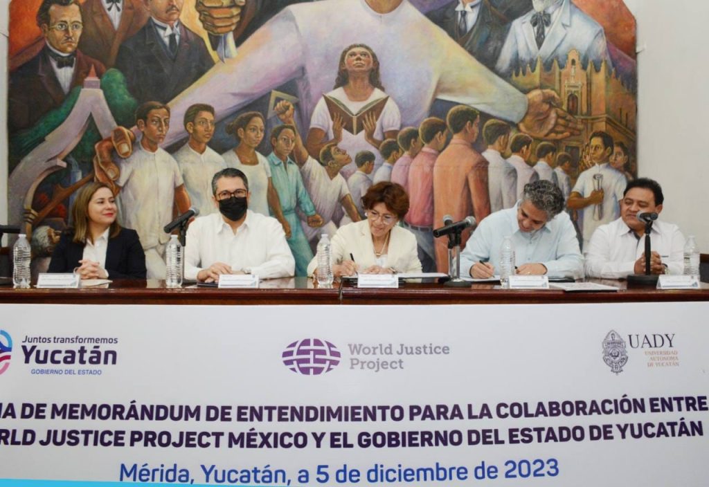 Mérida, Yucatán, 5 de diciembre de 2023.- Se da un paso más en la construcción de un Yucatán más justo y equitativo para todos los yucatecos al realizar la firma de convenio el Gobierno del Estado con World Justice Project, reconocida organización internacional que trabaja para avanzar en el Estado de Derecho en el mundo, como parte de las acciones que impulsa el Gobernador Mauricio Vila Dosal para aplicar una justicia transparente, la rendición de cuentas y la lucha contra la corrupción.