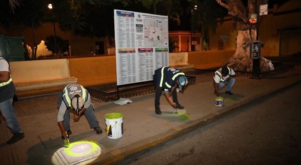 Mérida, Yucatán, 8 de septiembre de 2020.- Personal del Gobierno del Estado realiza las labores señalización de las nuevas áreas de ascenso y descenso de las diferentes rutas del transporte público, que comenzarán a funcionar a partir del próximo domingo 13 de septiembre, como parte del Plan de Mejora a la Movilidad Urbana para el Centro Histórico de Mérida, cuyo objetivo es reducir posibles contagios, proteger la salud y seguridad de los yucatecos que a diario usan el servicio, mejorar la movilidad peatonal y vehicular, así como contribuir a evitar aglomeraciones y mejorar la sana convivencia en esta zona de la urbe.