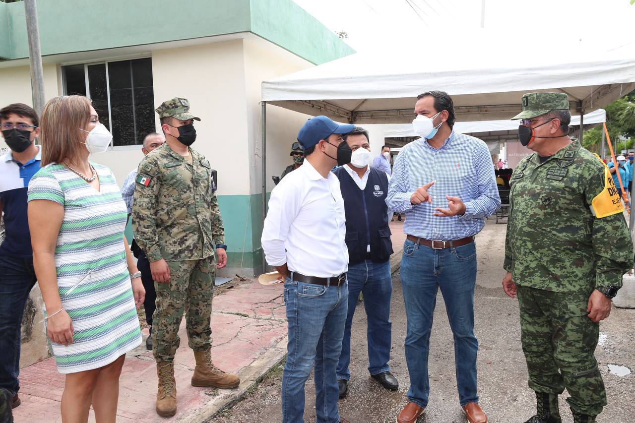 Junto con el Teniente de Corbeta René Alberto Pozo Burgoin, en representación del coordinador Estatal para la Vacunación Covid-19, así como la delegada del Instituto Mexicano del Seguro Social (IMSS) en Yucatán, Miriam Sánchez Castro, el Gobernador estuvo recorriendo las áreas de registro, vacunación y recuperación que conforman este módulo.