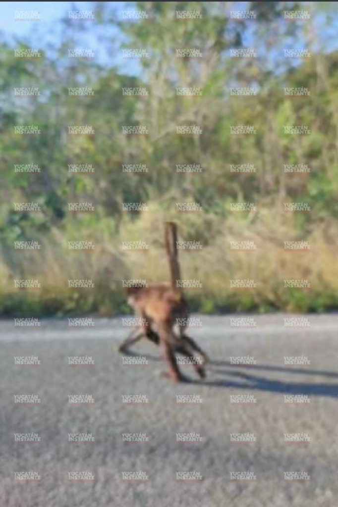 Menuda sorpresa causó este ateles al ser avistado por personas que circulaban en dicho tramo alrededor de las 4 de la tarde, por lo que dieron parte a la Policía Municipal de Hunucmá.