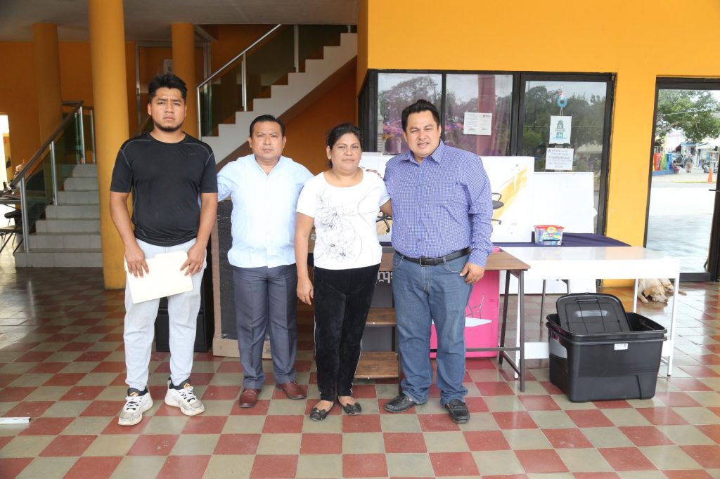 A nombre del alcalde Edwin Bojórquez, entregaron el material Hilario de Jesús Uicab, secretario municipal, y Edson Herrera, secretario técnico del municipio, a la directora del plantel Eva Bautista.