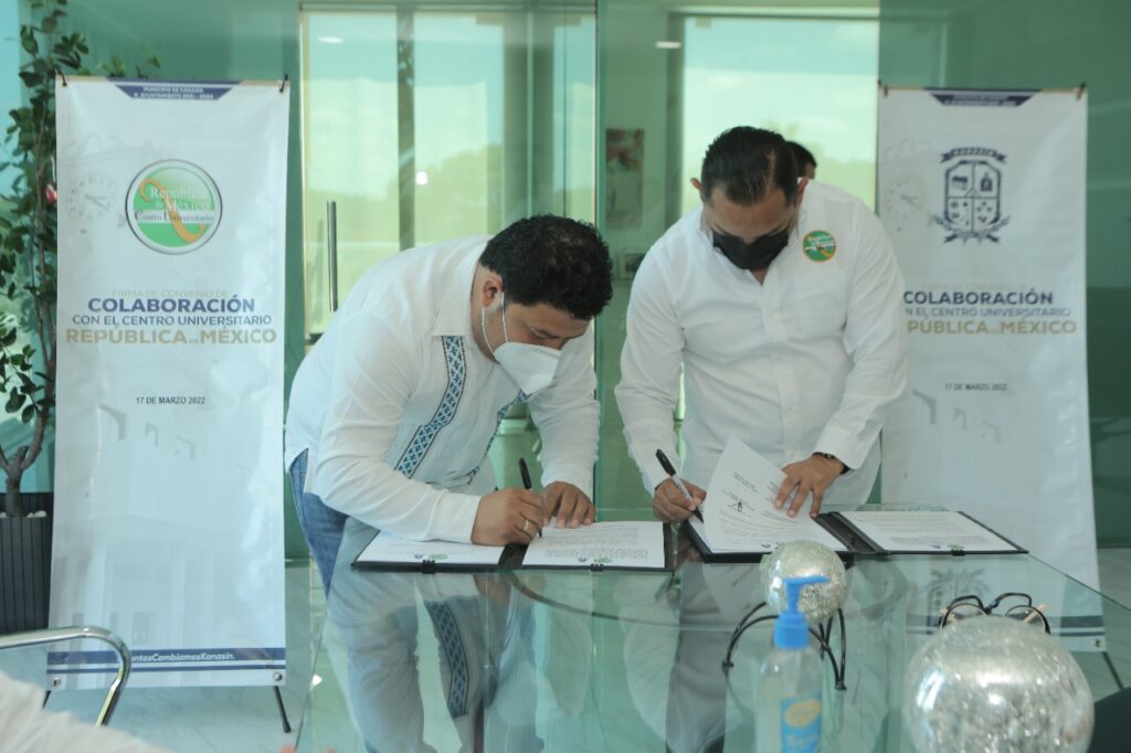 Suscribieron el documento el alcalde de Kanasín, Edwin Bojórquez Ramírez, y el presidente del Consejo de Administración del Corporativo Universidad República de México, Manuel Jesús Herrera Cetina. Atestiguaron la firma del documento el secretario municipal Jesús Uicab Can; el regidor de Educación de la Comuna, Aarón Solís Herrera; la directora académica del Centro Universitario República de México, Irina Herrera Cetina, entre otros funcionarios.