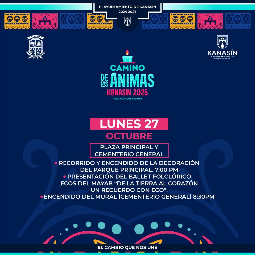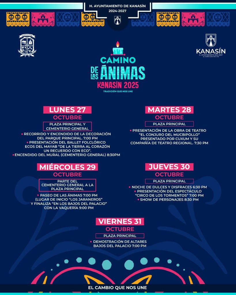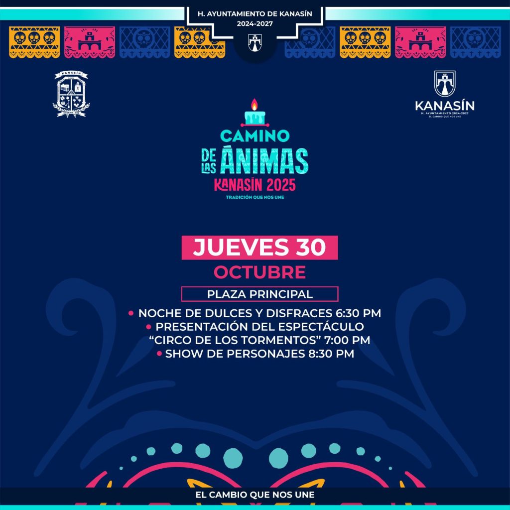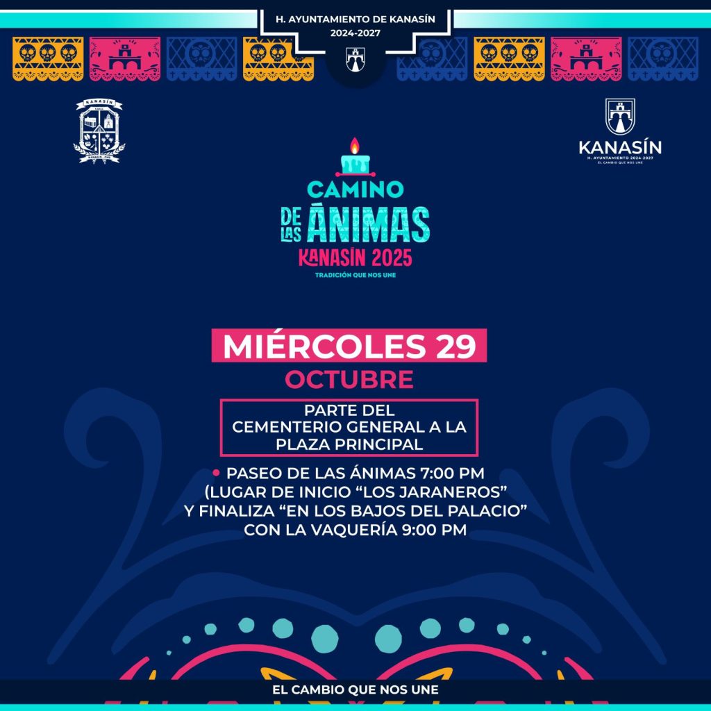 Kanasín, Yucatán a 25 de octubre 2025.- Con el objetivo de preservar las tradiciones y costumbres en estas fechas, el Ayuntamiento de Kanasín invita al público en general a participar en el programa “Camino de las Ánimas”, que consistirá en una serie de actividades en el marco del ‘Día de Muertos’ y que incluye eventos artísticos, gastronómicos (con la muestra de altares) y culturales, como el ‘Paseo de las Ánimas’.