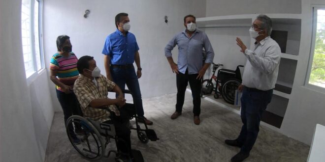 En ese contexto, el alcalde Alejandro Ruz Castro visitó esta mañana, en la colonia Dolores Otero, el predio de la señora Reyna Cahum Medina, beneficiaria de la obra que incluye las adaptaciones necesarias para el adecuado desplazamiento de su esposo, señor Ángel Martín Soberanis, quien padece una discapacidad motriz.