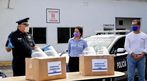 Mérida, 30 de mayo de 2020. En una muestra de apoyo y solidaridad a las acciones del Ayuntamiento encabezado por el alcalde Renán Barrera Concha ante la contingencia sanitaria por el Covid-19, el corporativo Farmacias YZA entregó un donativo de 400 caretas para elementos de la Policía Municipal, a fin de reforzar la protección de los agentes durante sus labores.