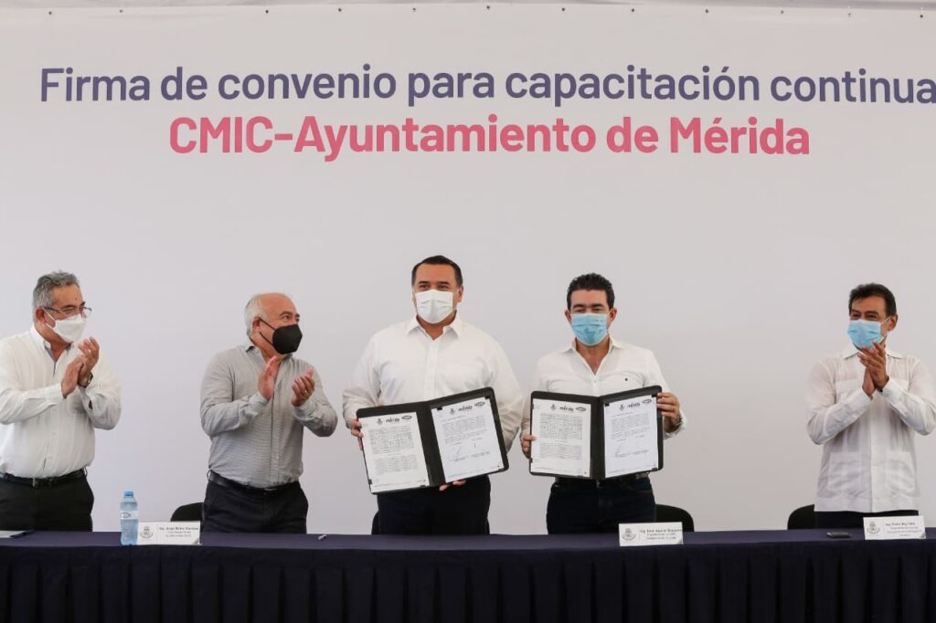 Mérida, 26 de octubre de 2021.- Con el compromiso de seguir avanzando en la reactivación económica, el Ayuntamiento de Mérida y la Cámara Mexicana de la Industria de la Construcción (CMIC) firmaron esta mañana el convenio de colaboración “2 al millar”, que busca impulsar la capacitación de los trabajadores de la industria de la construcción.