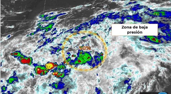 La zona de baja presión que se ubica esta noche en el Mar Caribe, a 445 kilómetros al sureste de Chetumal, Quintana Roo, registra esta noche 50% de posibilidad de desarrollo ciclónico en 48 horas o menos, informa el OCPY de la Conagua.