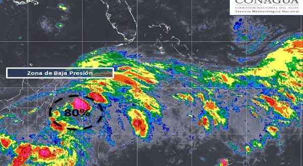 La zona de baja presión que se ubica en el occidente del Mar Caribe mantiene este mediodía un 80% de posibilidad de desarrollo ciclónico en 48 horas o menos y ha empezado a tener un desplazamiento con dirección norte, informa el OCPY de la Conagua.