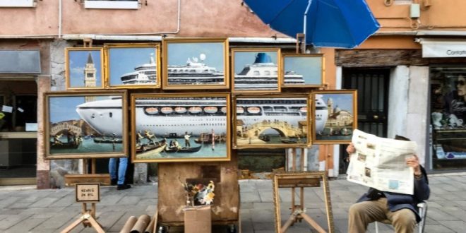 El artista británico Banksy realizó una representación artística en Venecia, Italia, al hacerse pasar por un pintor y colocar un puesto callejero con varios lienzos que acaban formando la imagen de un enorme crucero que llegaba a la Ciudad de los Canales.