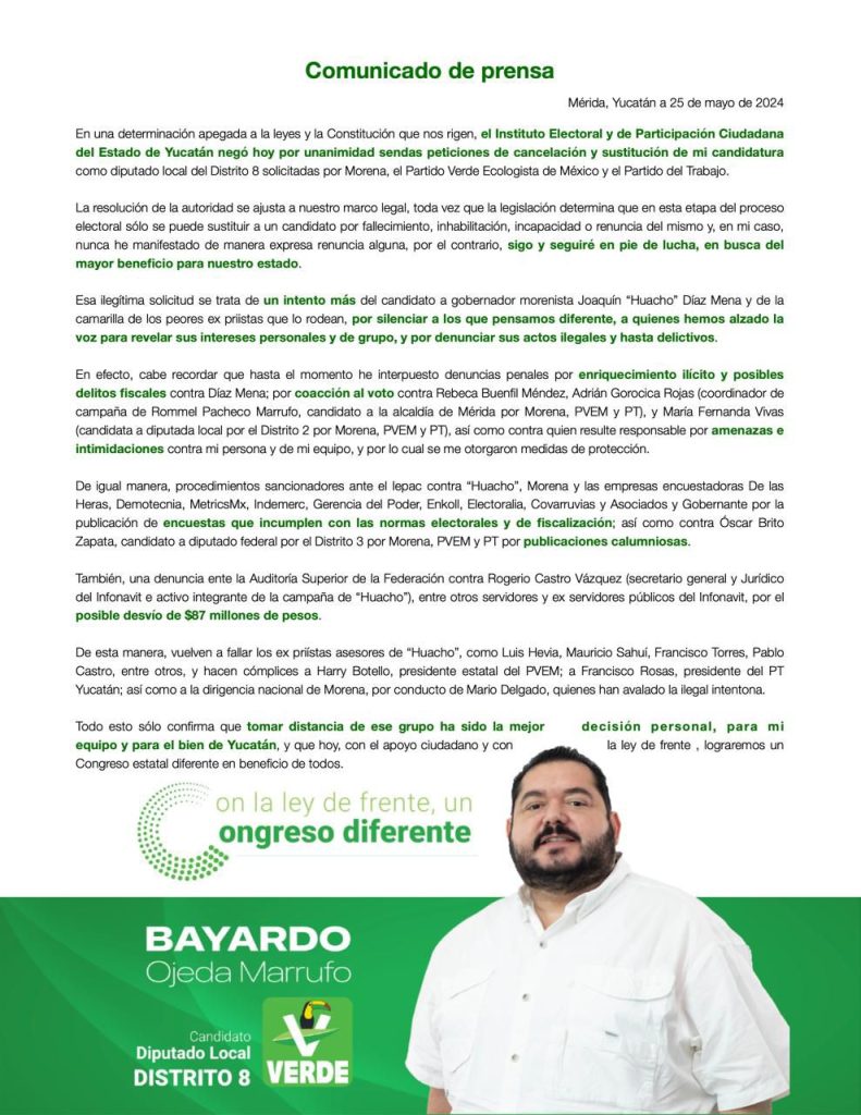 Mérida, Yucatán a 25 de mayo de 2024.- En una determinación apegada a la leyes y la Constitución que nos rigen, el Instituto Electoral y de Participación Ciudadana del Estado de Yucatán negó hoy por unanimidad sendas peticiones de cancelación y sustitución de mi candidatura como diputado local del Distrito 8 solicitadas por Morena, el Partido Verde Ecologista de México y el Partido del Trabajo.