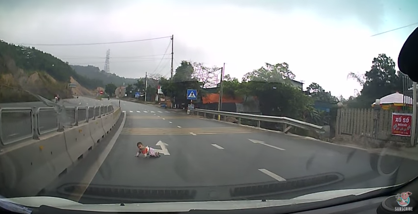 Un fatal accidente estuvo a punto de ocurrir en Quang Ninh, Vietnam, cuando un bebé cruzó la carretera, forzando al conductor de un vehículo a frenar bruscamente.
