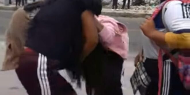 Ante decenas de compañeros que solo se quedaron mirando como los chinos, se dieron de jaloneos de pelo una muchachita contra dos adolescentes, donde afortunadamente no pasó a más.