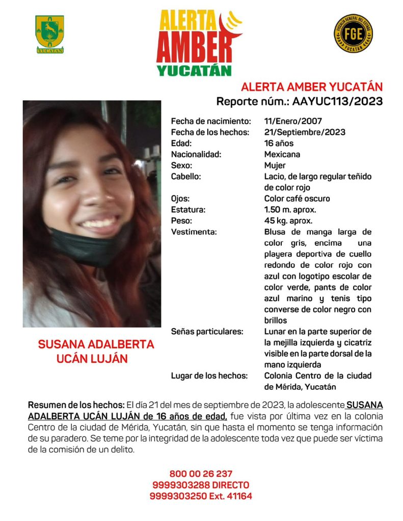 MÉRIDA, Yuc., 22 de septiembre 2023.- Susana Adalberta Ucán Luján es una adolescente de 16 años de edad que ayer fue vista por última vez en el Centro de Mérida, y su familia no tiene información sobre su paradero, por lo cual se reportaron los hechos ante las autoridades.
