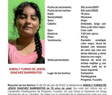MÉRIDA, Yuc.- Tiene 15 años de edad Shenly Yuriko de Jesús Sánchez Barrientos, y desde el 3 de julio no se sabe nada de ella, por lo que su familia solicitó el apoyo de las autoridades, que a su vez piden el apoyo de la población yucateca, a través de una Alerta Amber.